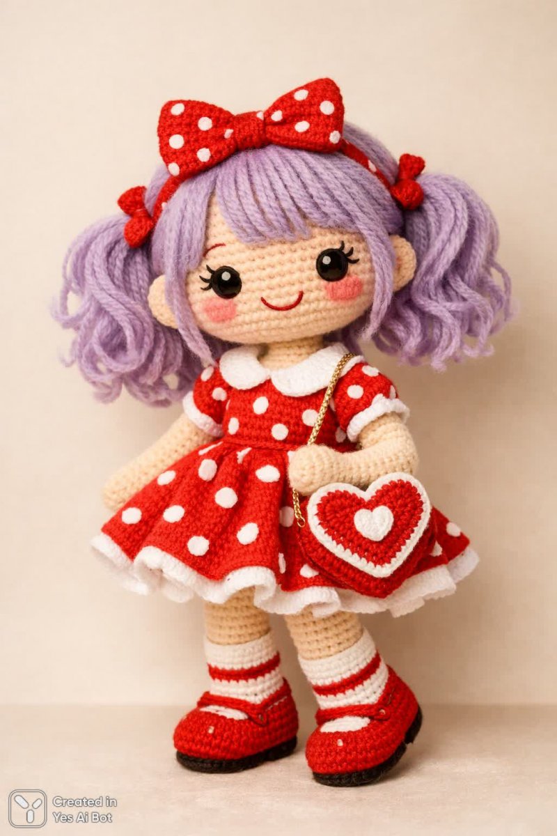 crocheted doll with lavender hair, dressed in a red and white polka dot outfit, tiny heart-shaped purse, cheerful smile on face, BG is soft beige, high-quality, soft lighting, capturing playful and festive essence of love.