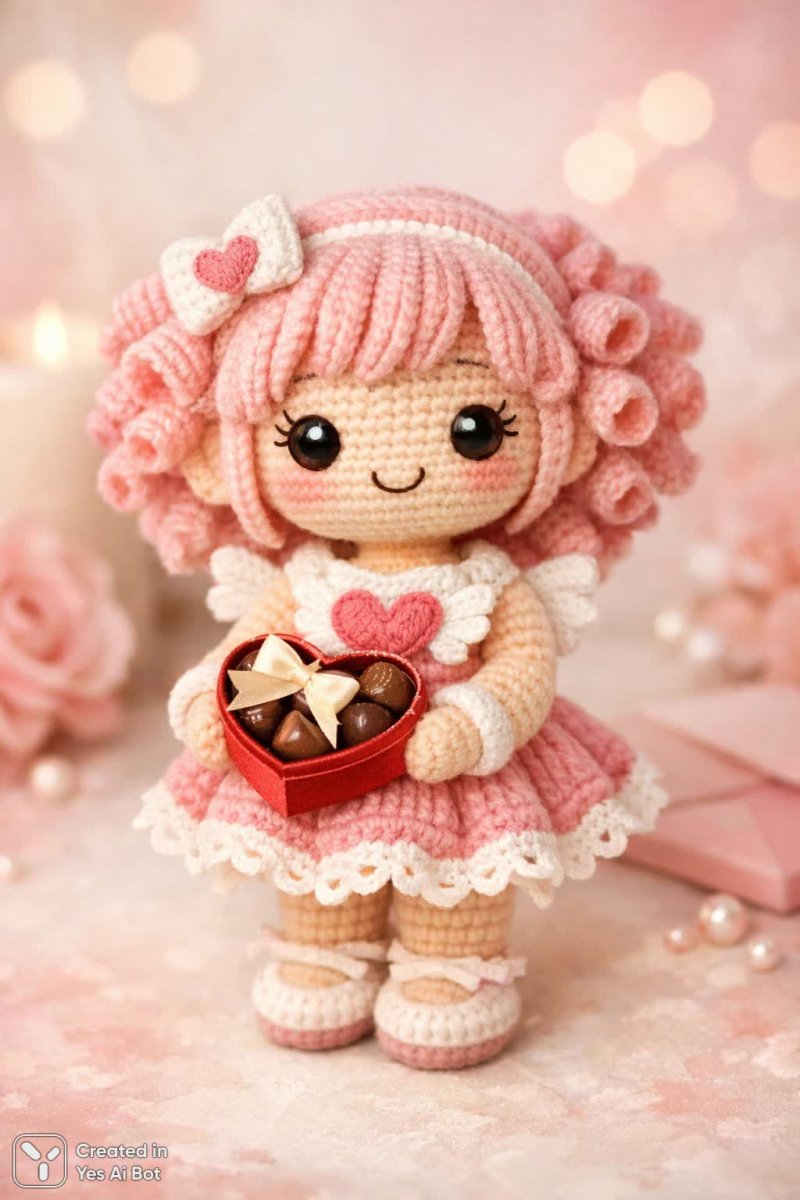crocheted doll with pink hair styled in curls, wearing a love-themed sweater with a heart design, round face with cheerful expression, holding a small chocolate box, BG is pastel-colored, high-quality, soft lighting, encapsulating the sweetness of Valentine's Day.