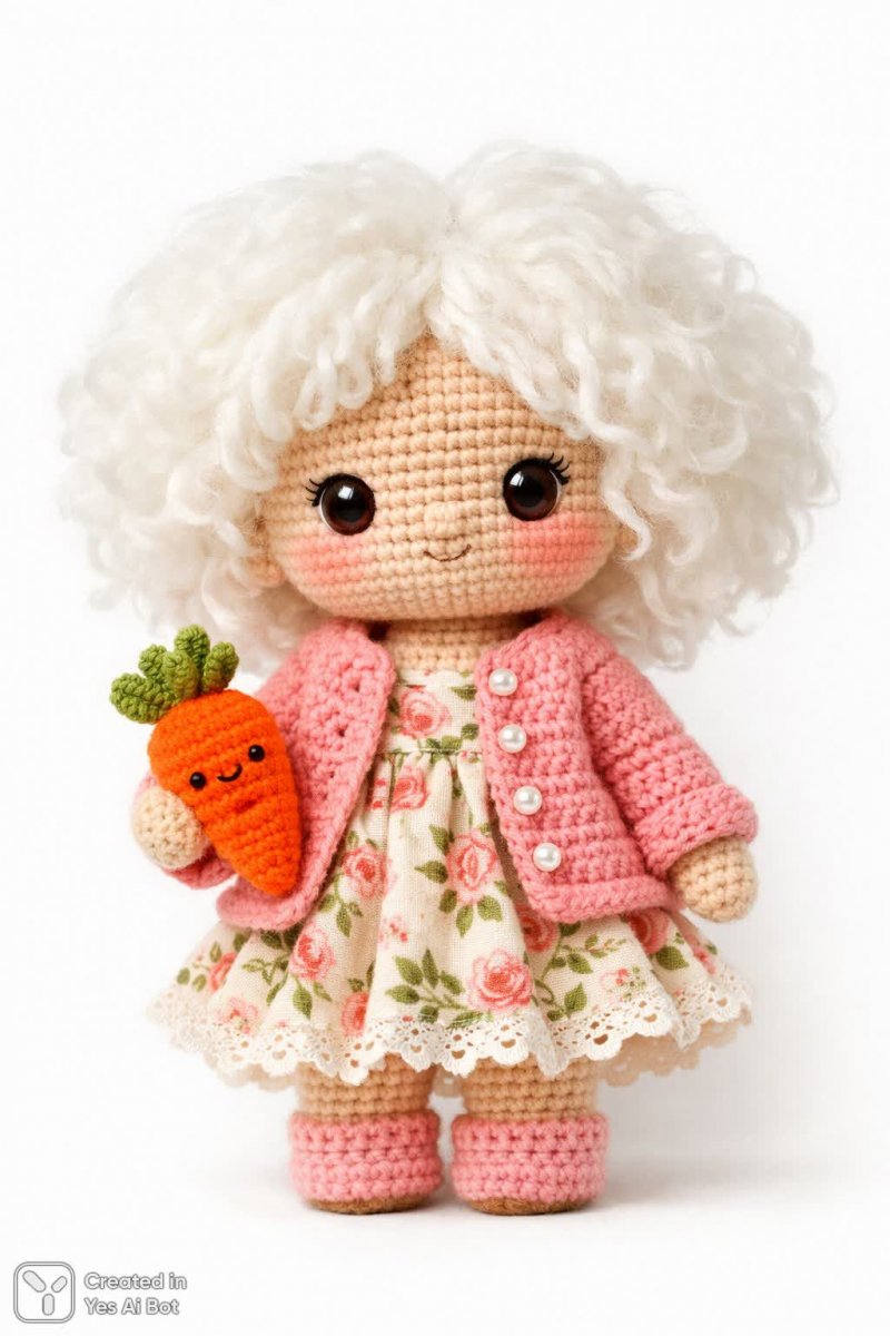 crocheted doll with fluffy white hair, wearing a pink cardigan over a floral dress, round face with big brown eyes, holding a small carrot plushie in one hand, BG is plain white, high-quality, soft lighting, focusing on the adorable details and textures of the outfit.