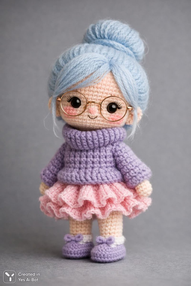 crocheted doll with pastel blue hair styled in a bun, dressed in a cozy lavender sweater and cute pink skirt, small round glasses perched on tiny nose, standing against a gray BG, high-quality, soft lighting, emphasizing the sweet expression and crochet intricacies.