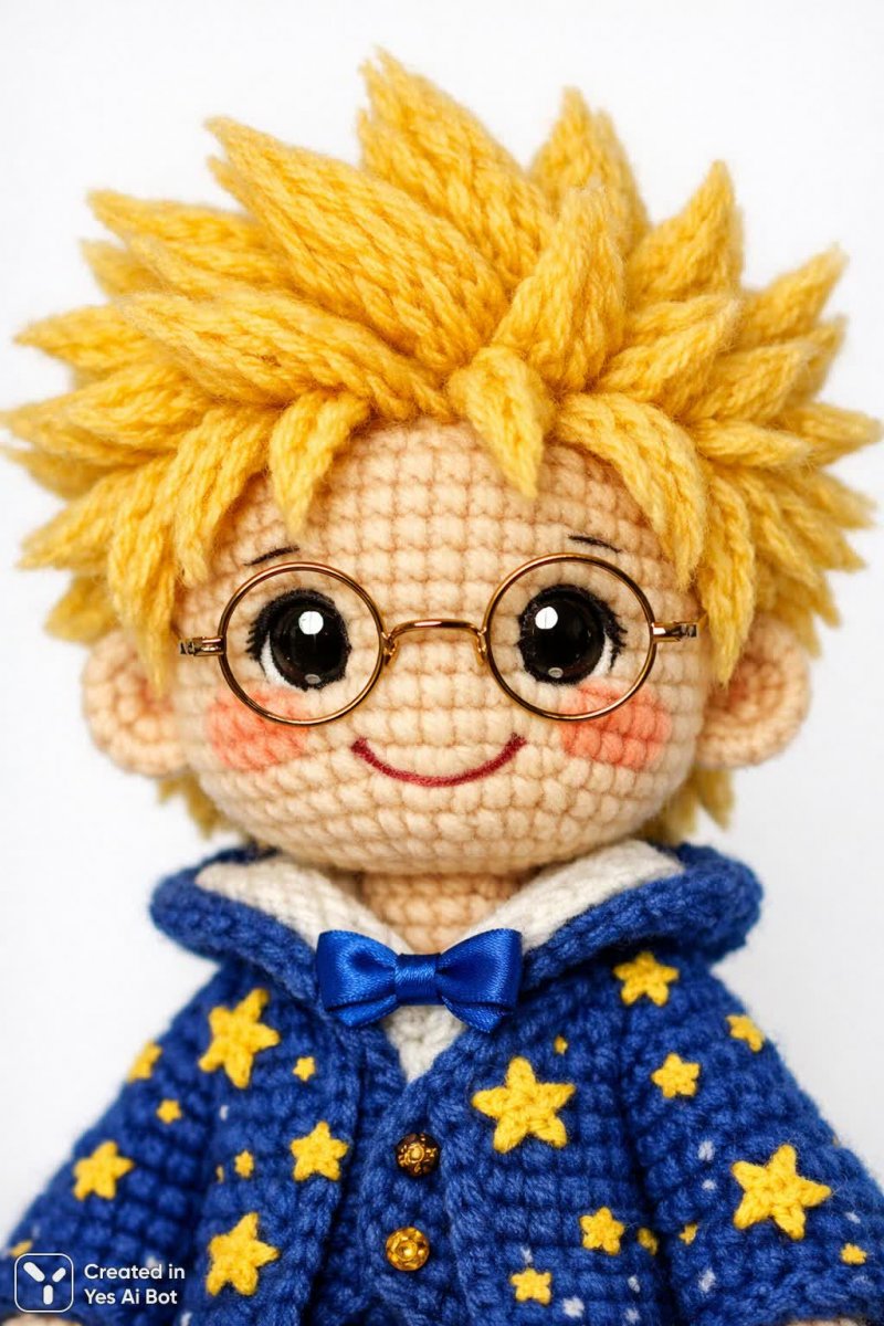 Милая вязаная кукла ручной работы с лучезарной улыбкой и задорными желтыми волосами, словно маленькие солнечные иголочки, притягивает взгляд своей непосредственностью и очарованием. Маленький круглый очки придают ей трогательный вид интеллектуала или озорного проказника. На ней уютный голубой свитер, украшенный игривыми звездочками – деталью, добавляющей образу легкости и беззаботности. Фон нейтрально-белый подчеркивает красоту кропотливой работы крючком, позволяя полностью сосредоточиться на выразительных чертах лица куклы и тонкости вязаных деталей. Мягкое освещение создает ощущение тепла и уюта, словно это маленький персонаж сошел со страниц любимой сказки. Каждая деталь, от аккуратной прошивки до нежной текстуры пряжи, свидетельствует о мастерстве рукодельца и любовью к своему делу. Этот крошечный шедевр наполнен позитивом и дарит ощущение радости одним своим видом – идеальный подарок для любителя милых вещиц или просто чтобы поднять настроение в серый день. Вязаная кукла с ярким характером излучает тепло, уют и очарование ручной работы