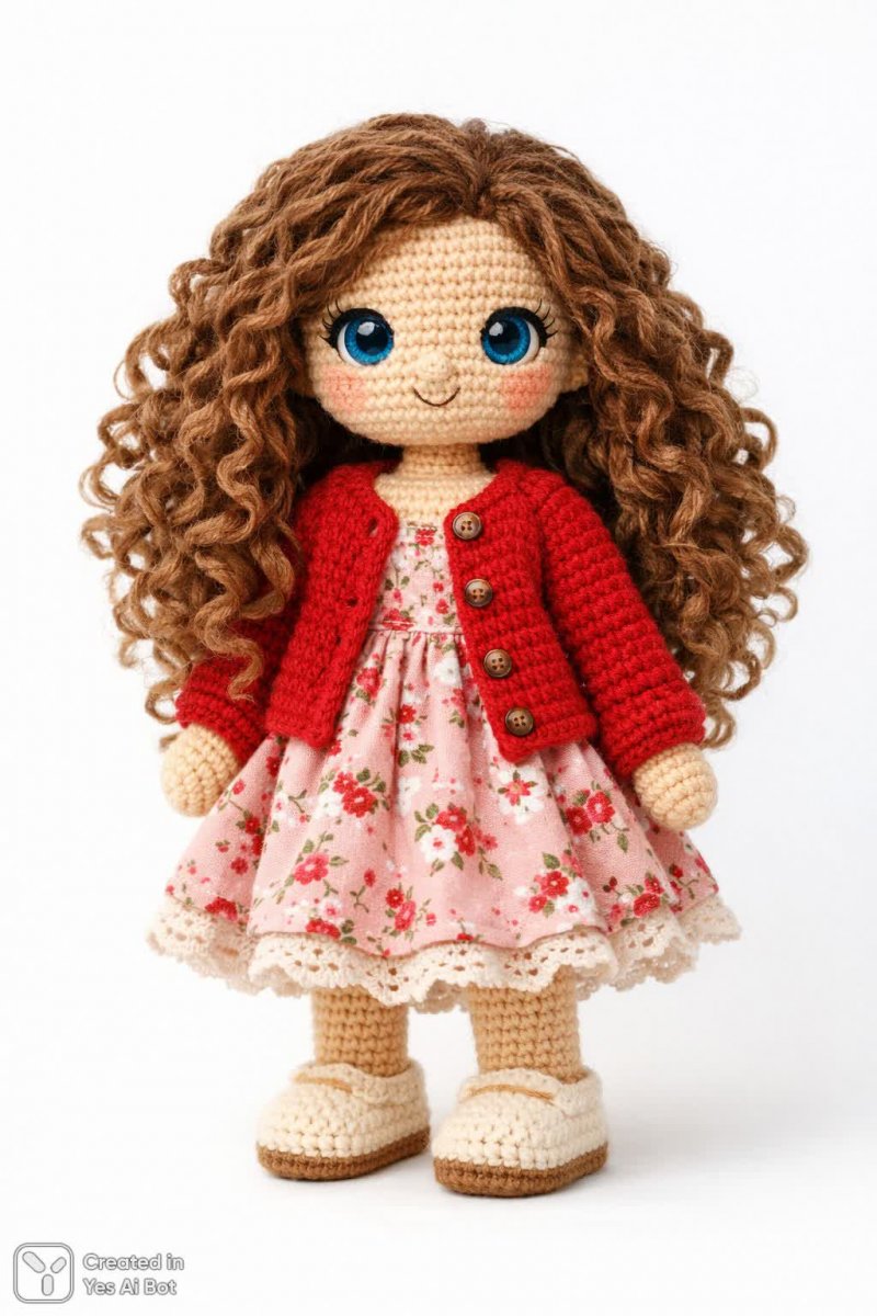 crocheted doll with long curly brown hair, wearing a cozy red cardigan over a pink floral dress, round face with bright blue eyes, standing on a white BG, high-quality, soft lighting, capturing intricate stitches and playful essence of the doll's outfit.