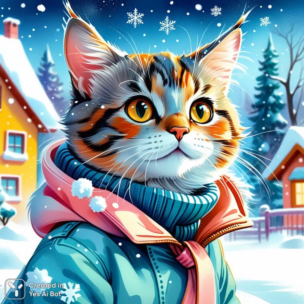 Заснеженный кот: юмористический зимний этюд в пастельных тонах и акварели - Картинка, полученная с помощью нейросети Stable Diffusion