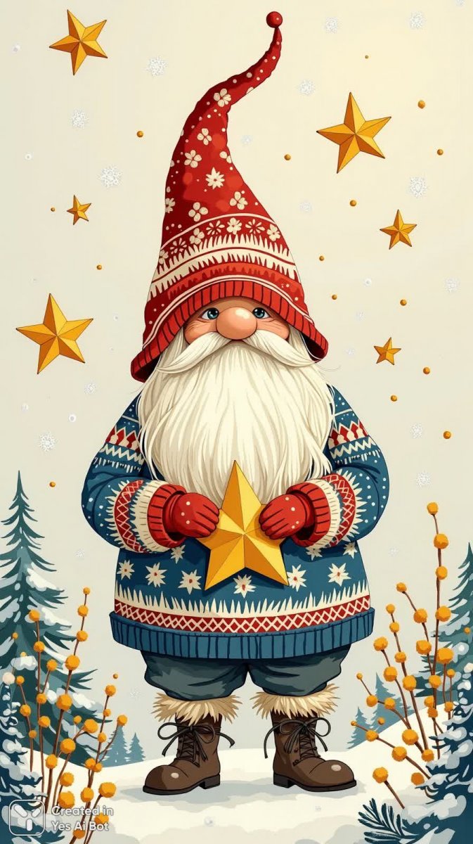 #4. cartoonish paper cut gouache illustration of a tall gnome with a pointed hat, clutching golden stars, wearing a patterned sweater and furry pants, standing amid a winter landscape with snowflakes falling and a festive aura #role_toys