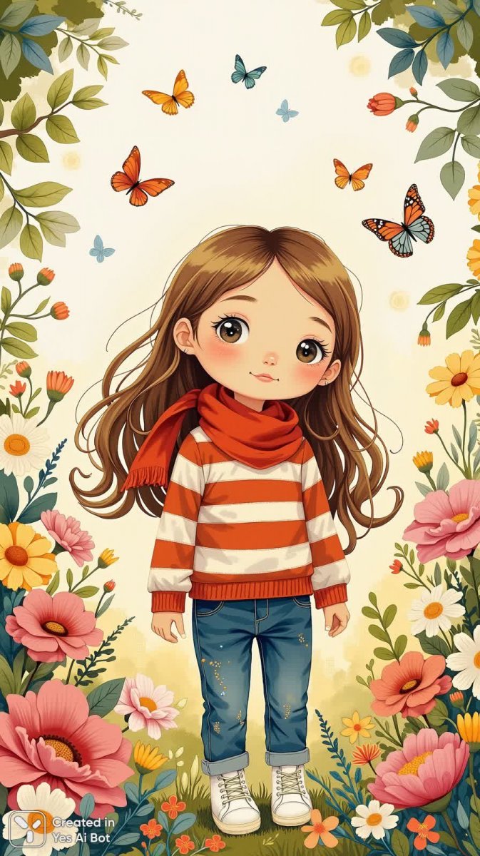 #2. zentagle illustration of a doll with long brown hair and a red scarf, wearing a striped sweater and white sneakers, round face with small nose, standing in a garden filled with blooming flowers and butterflies, sunny atmosphere #role_toys