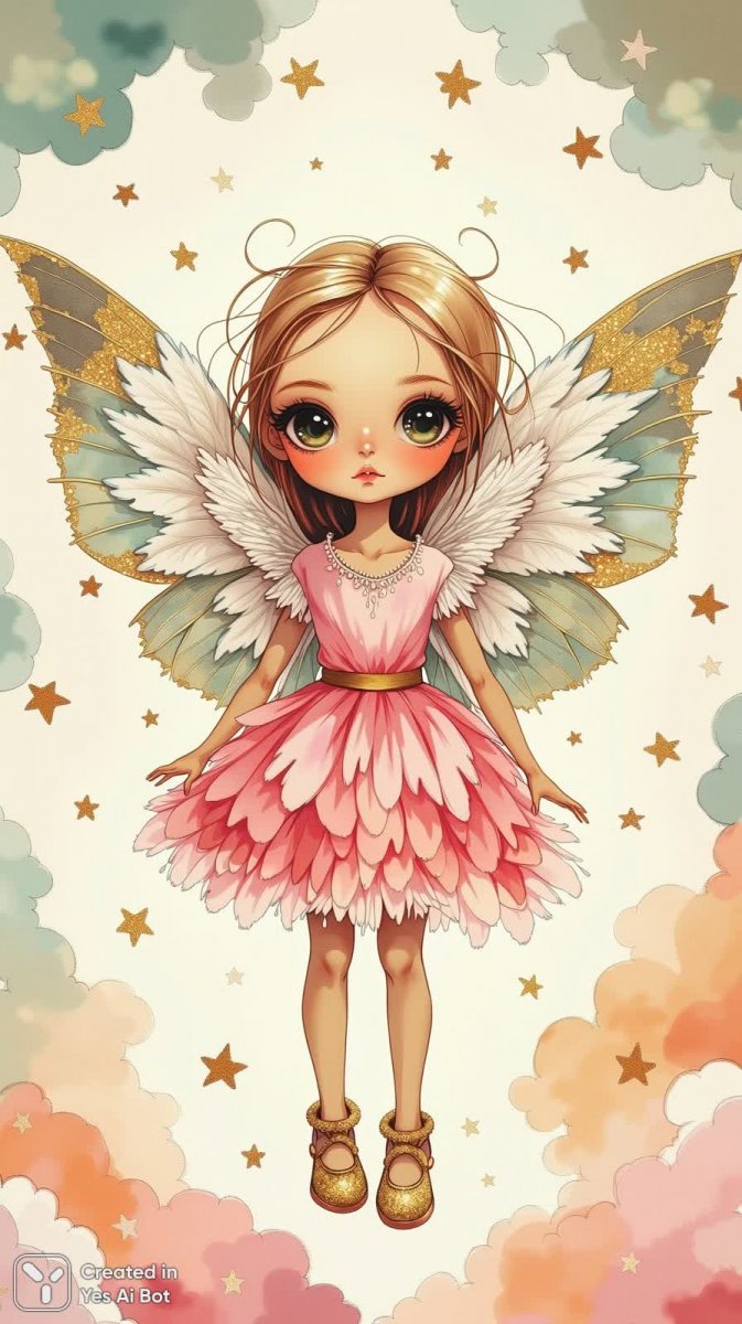 #5. naive art depiction of a doll resembling a fairy, in a pink dress with white feathers and gold shoes, sporting large glittery wings, surrounded by a dreamy cloud backdrop with twinkling stars and soft pastel colors #role_toys