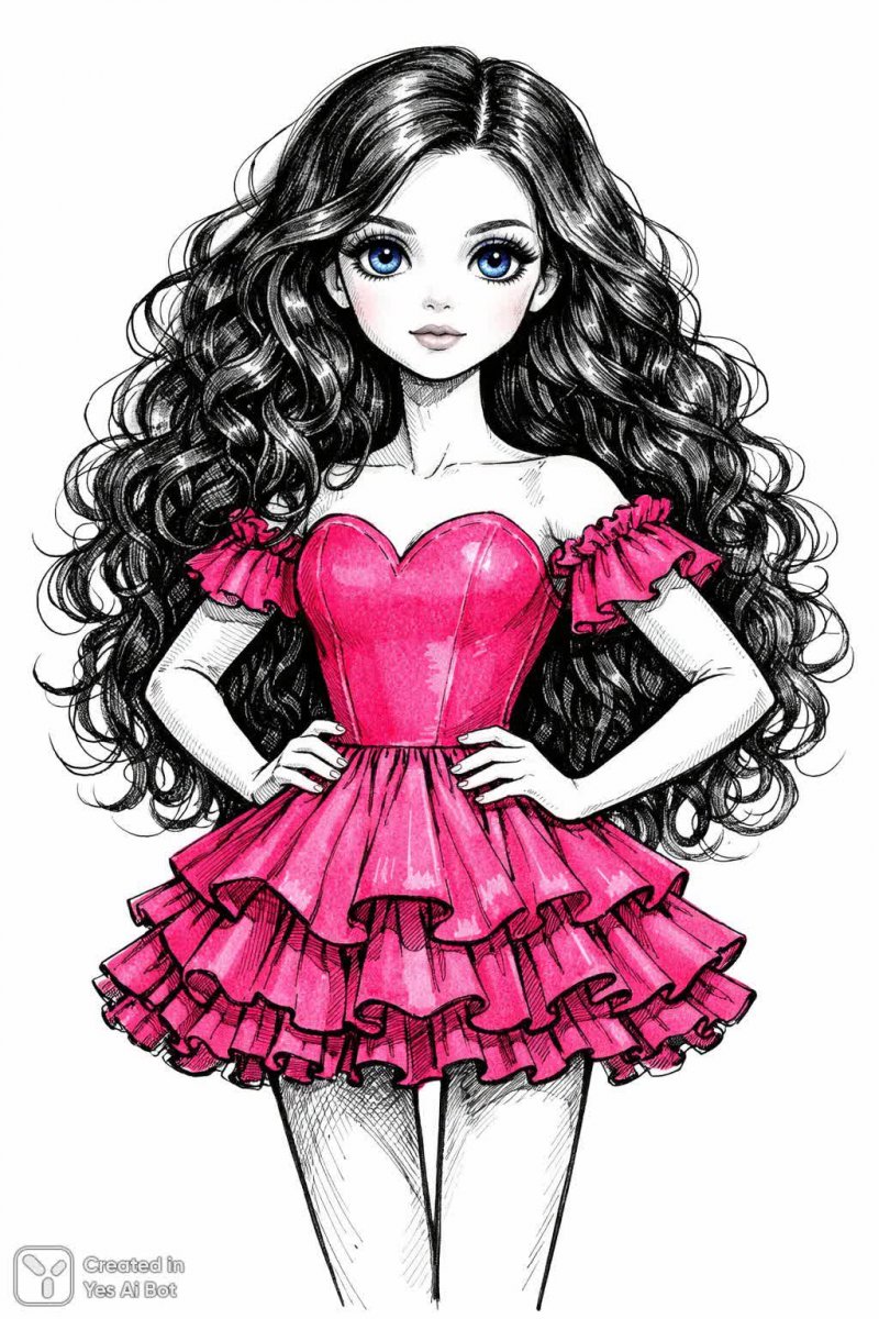 #1. ink drawing of doll with long curly brown hair and blue eyes, wearing vibrant pink dress with heart-shaped bodice, featuring ruffled hemline and lace skirt, standing with both hands on hips, bg is white #role_doll