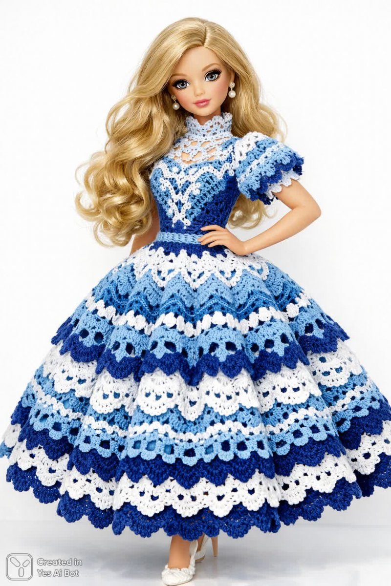 #3. naive art of doll wearing blue and white crochet dress, full skirt and high neckline, intricate crochet pattern in shades of blue, styled with long loose curls, standing with one hand on hip, bg is white #role_doll