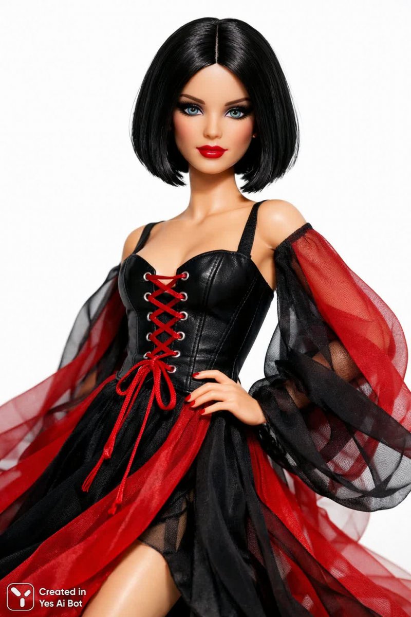 #2. barbie doll with long black hair in sleek bob, wearing black and red flowy dress with lace-up detail at waist, looking directly at camera, bg is white #role_doll