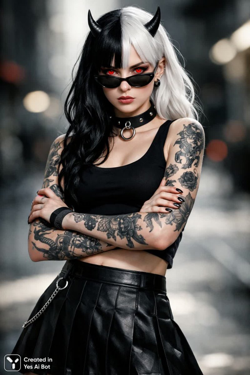 Таинственная демоница с контрастной внешностью приковывает взгляд своей двойственностью. Её волосы разделены на две половины – угольно-черную и белоснежную, создавая эффект драматического перехода, подчеркнутый пронзительным взглядом красных глаз. Стильные солнцезащитные очки добавляют образу нотку загадочности и скрывают часть эмоций, оставляя простор для воображения. Руки украшены замысловатыми татуировками, словно повествующими о её темном прошлом или магических способностях. Черная юбка акцентирует стройность фигуры, а чокер на шее завершает ансамбль, добавляя бунтарский и дерзкий штрих. Серьезное выражение лица выдает силу воли и решительность, намекая на сложный характер и готовность к любым вызовам. Высококонтрастное освещение подчеркивает драматизм сцены, выделяя детали и создавая ощущение глубины. Размытый городской фон служит лишь фоном для этой загадочной фигуры, не отвлекая внимания от её притягательной красоты и скрытой силы. Вся композиция пронизана атмосферой тайны и опасности, заставляя зрителя задуматься о судьбе этой необыкновенной девушки. Она словно воплощение двойственности – света и тьмы, нежности и жестокости, надежды и отчаяния. Её образ остается в памяти надолго, вызывая смешанные чувства восхищения и страха