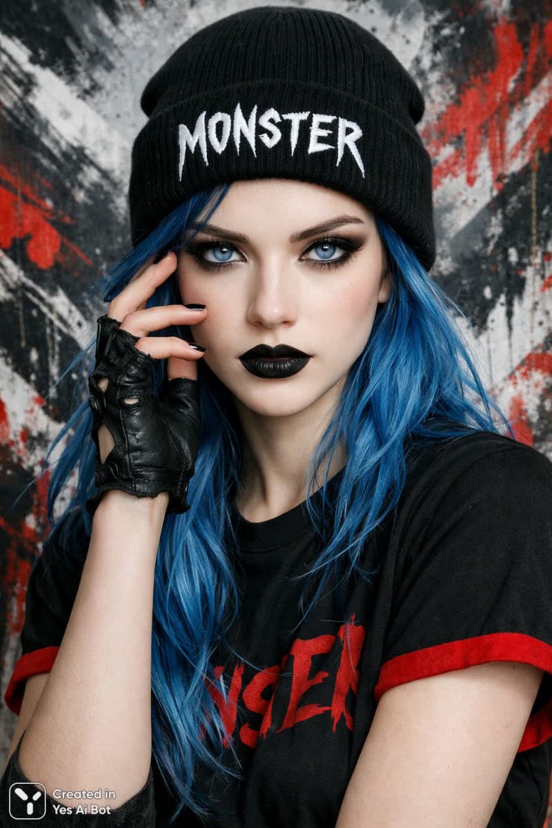 2. pale-skinned girl with blue hair and dark lipstick, black beanie with monster text, sharp blue eyes, wearing a black t-shirt with red details, expressive look, black fingerless gloves, background with abstract patterns, style raw