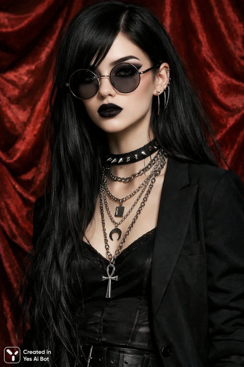 Загадочная и мрачная красота в стиле эмо готик – это портрет девушки с длинными волосами, собранными в стильные космические пучки. Ее образ дополняют круглые очки, подчеркивающие взгляд, и лаконичный черный наряд, который создает атмосферу таинственности. Многослойные ожерелья добавляют индивидуальности и завершают ансамбль, придавая ему глубину и изысканность. Фон, выполненный в насыщенных бордовых тонах с богатой текстурой ткани, усиливает драматизм композиции и создает ощущение роскоши и утонченности. Выразительный макияж с акцентом на смелую подводку для глаз придает взгляду пронзительность и загадочность, делая этот образ незабываемым воплощением готического стиля с элементами современной моды. Это не просто фотография – это история о сильной и независимой девушке, которая уверенно выражает свою индивидуальность через стиль и самовыражение. В этом образе чувствуется бунтарский дух и глубокий внутренний мир. Каждый элемент тщательно подобран, чтобы создать гармоничный и запоминающийся ансамбль, который притягивает взгляд и вызывает восхищение. Это визуальный манифест готической эстетики в современном исполнении