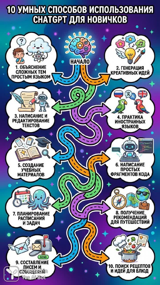 Десять умных способов использования ChatGPT для начинающих: красочная инфографика. Картинка из нейросети Нано Банана