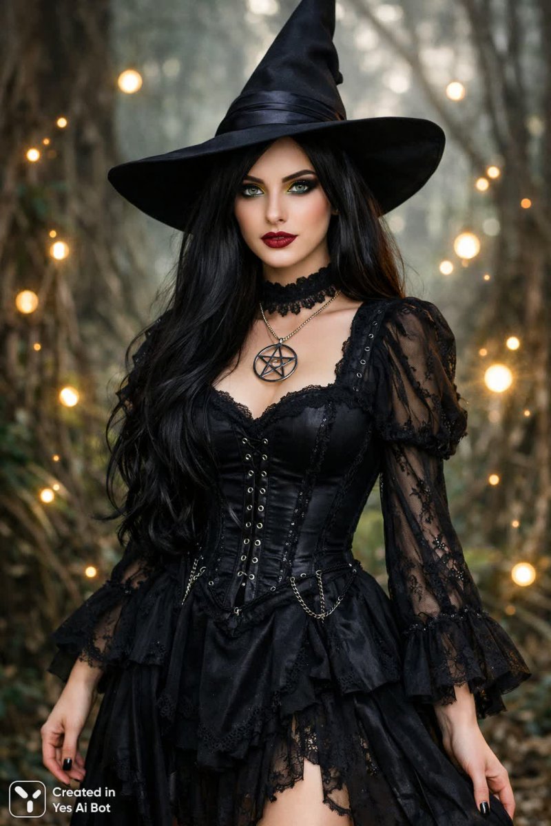 cute witch with long black hair, wearing a gothic black dress with lace details, pointed hat, silver pentagram necklace, dark red lipstick, sparkling green eyes, standing in a mystical forest, glowing orbs around, enchanting atmosphere, art style --style raw