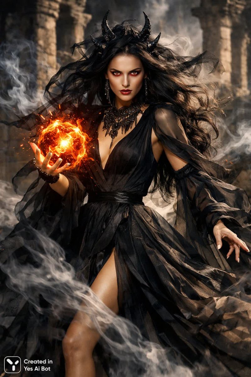 dark witch with glowing red eyes, summoning fiery orb, ancient ruins in the background, dramatic shadows, swirling smoke around her, fierce expression, long flowing dress, chaotic magic aura