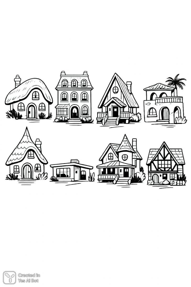 various drawn houses, outline illustration, minimalistic style, black and white, soft shapes, playful design, different roof styles, no background, cozy neighborhood vibe, hand-drawn.