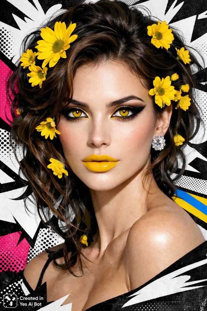 Изображение демонстрирует портрет женщины с нежным убранством лица в виде желтых цветов и завораживающими золотистыми глазами. Лицо органично интегрировано в абстрактный фон из графичных черно-белых полос, что создает эффектную визуальную глубину и динамику, добавляя изображению современности и экспрессии. Вдохновленный эстетикой поп-арта, рисунок характеризуется использованием ярких, насыщенных цветов, оживляющих композицию и придающих ей энергию. Контраст между реалистичным изображением лица и абстрактным фоном создает интригующий визуальный парадокс, представляя собой гимн красоте, яркости и творческой свободе. Это произведение сочетает в себе элементы классической портретной живописи с современными художественными приемами, вызывая восхищение своей оригинальностью и мастерством исполнения. Зритель приглашается задуматься о взаимосвязи между реальностью и иллюзией, красотой и абстракцией, ощущая при этом позитив и оптимизм, исходящий от портрета, словно окунаясь в мир ярких красок и безграничной фантазии. Работа создана нейросетью Sora Images в стилях Fashion и Luxury с высокой детализацией.