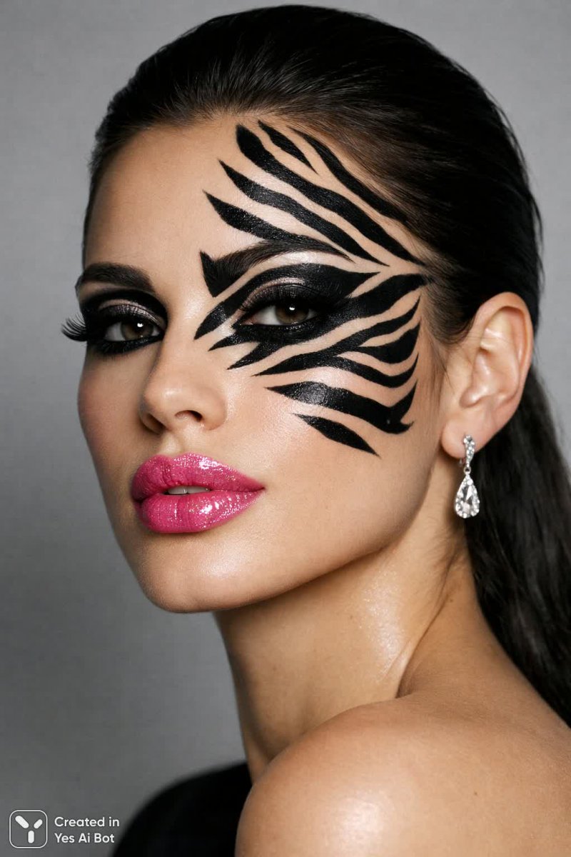 3. hyper-realistic portrait of a beautiful woman with black zebra stripe makeup, her glossy lips shimmering with pink, set against a minimalist gray background that whispers luxury.