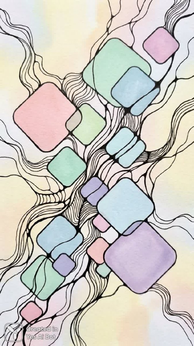 Мягкий пастельный фон создает умиротворяющую атмосферу, служа идеальным холстом для замысловатого нейрографического рисунка. Вид сверху демонстрирует четкую перспективу композиции, подчеркивая гармонию и порядок. Геометрические формы, представленные в виде округлых квадратов без острых углов, плавно перетекают друг в друга, создавая ощущение текучести и динамизма. Разнообразие цветов – от нежных оттенков розового и голубого до теплых тонов желтого и оранжевого – добавляет визуальный интерес и глубину. Высокая детализация каждого элемента позволяет рассмотреть мельчайшие нюансы текстуры и формы, погружая зрителя в мир спокойствия и созерцания. Этот рисунок излучает позитивную энергию и способствует концентрации внимания, идеально подходя для использования в качестве обоев или иллюстраций, направленных на создание атмосферы гармонии и творчества. Композиция отличается сбалансированностью и визуальной привлекательностью, что делает ее универсальным украшением для любого пространства, стремящегося к умиротворению и эстетическому наслаждению