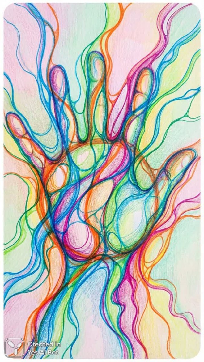 neurographic pattern, colored pencil technique, free abstract lines with soft rounded intersections, where intersections form palm print contours, bright colors, high detail, 8k resolution, pastel background, all corners in the drawing are rounded