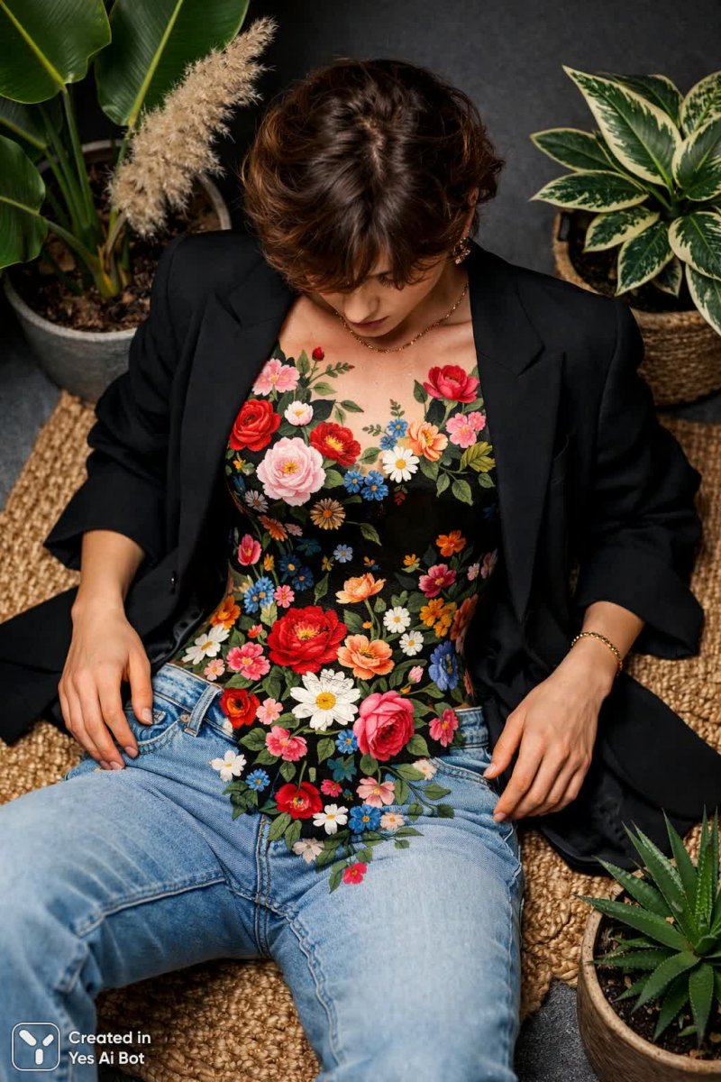 Главная особенность работы – поразительная прозрачность в средней части тела и конечностей модели, сквозь которые проглядывает изысканный узор цветочной ткани. Эта полупрозрачность создает эффект исчезновения и двойственности, добавляя изображению загадочности и фантазийности. Изображение отличается исключительной детализацией, позволяющей рассмотреть мельчайшие нюансы текстуры растений и сложность цветочного орнамента.