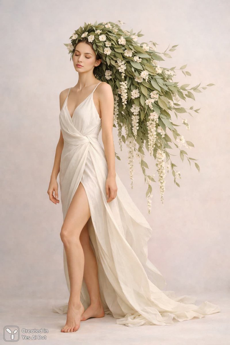 minimalist surreal portrait of a graceful woman with a serene expression, her hair transformed into cascading leaves and blossoms, set against a soft pastel background, detailed textures, fine art composition, photorealistic, canon eos r5, sigma art 35mm, full body shot, balanced lighting.