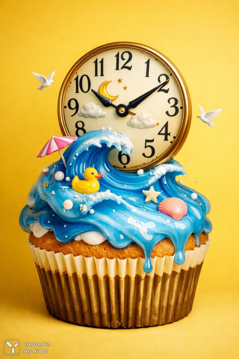 a whimsical composition of a giant cupcake with a glossy blue icing wave, topped with a surreal clock face, set against a vibrant yellow background, playful and imaginative design, high detail, soft studio lighting.