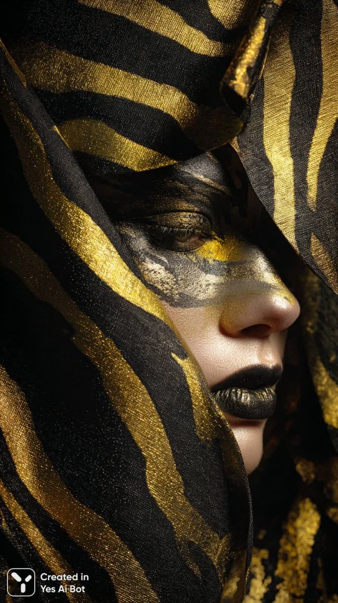 Изысканный портрет женщины, чье лицо завораживающе обрамлено контрастным сочетанием черных и желтых полос зебры. Эта визуальная метаморфоза гармонично вписана в атмосферу роскоши, вдохновленную эпохой ар-деко. В интерьере преобладают богатые золотистые акценты, добавляющие ощущение величия и утонченности. Яркие элементы поп-арта динамично оживляют композицию, создавая неожиданный и запоминающийся визуальный диалог между классической элегантностью и современной дерзостью. Лицо женщины, окутанное графическим рисунком зебры, выражает загадочность и силу, а окружающее пространство подчеркивает ее уникальность и статус. Вся картина пронизана чувством утонченного вкуса и творческого поиска, представляя собой яркое сочетание разных стилей и эпох. Это не просто портрет – это визуальная поэма о красоте, силе и безграничных возможностях искусства