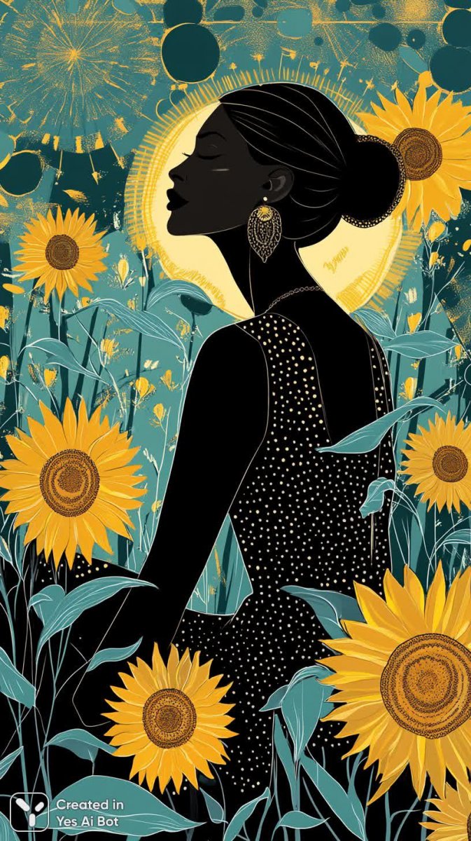 midjourney Чёрное кружево и подсолнухи: яркий портрет в технике инкворта. Картинка из нейросети Миджорни