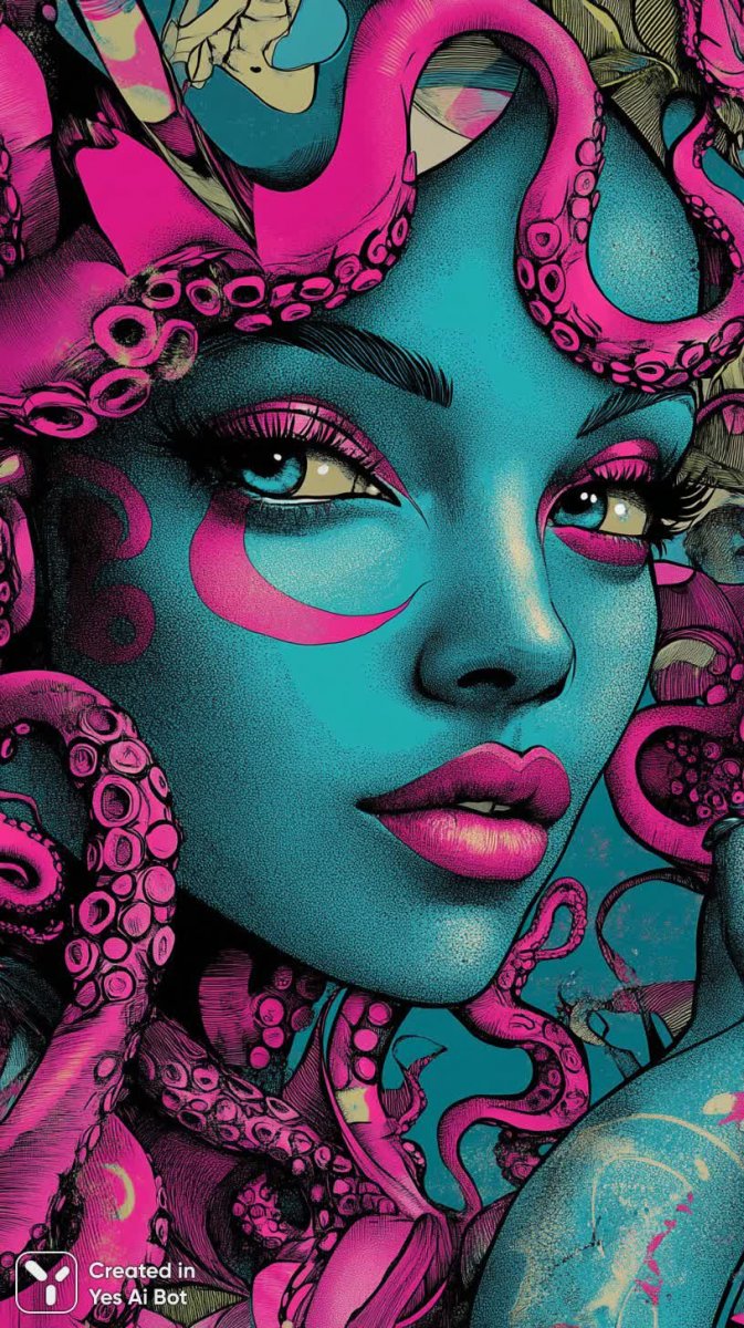 Завораживающий портрет женщины, украшенной яркими рисунками на теле, где доминирует мотив осьминога. Изображение оживлено неоновыми вихрями, создающими эффектную игру света и тени, а окружающие элементы контрастируют с центральным образом, добавляя глубину и сложность композиции. Это тщательно выполненная иллюстрация, выполненная в технике чернил, демонстрирующая мастерство художника в передаче деталей и текстур. Работа отличается динамичностью и выразительностью, сочетая в себе элементы фантазии и реализма. Яркие цвета и необычный выбор сюжетов делают этот портрет запоминающимся и притягивают взгляд зрителя, погружая его в мир мистики и творчества. Каждый штрих подчеркивает индивидуальность модели и создает ощущение таинственности, заставляя задуматься о символизме изображенных элементов. Это не просто рисунок — это визуальный рассказ, полный скрытых смыслов и художественных нюансов. Использование чернил позволяет добиться высокой детализации и четкости линий, что усиливает эффект присутствия и делает изображение максимально реалистичным, несмотря на фантазийный характер сюжета. Композиция тщательно продумана, чтобы создать гармоничный баланс между различными элементами, обеспечивая визуальную привлекательность и целостность произведения