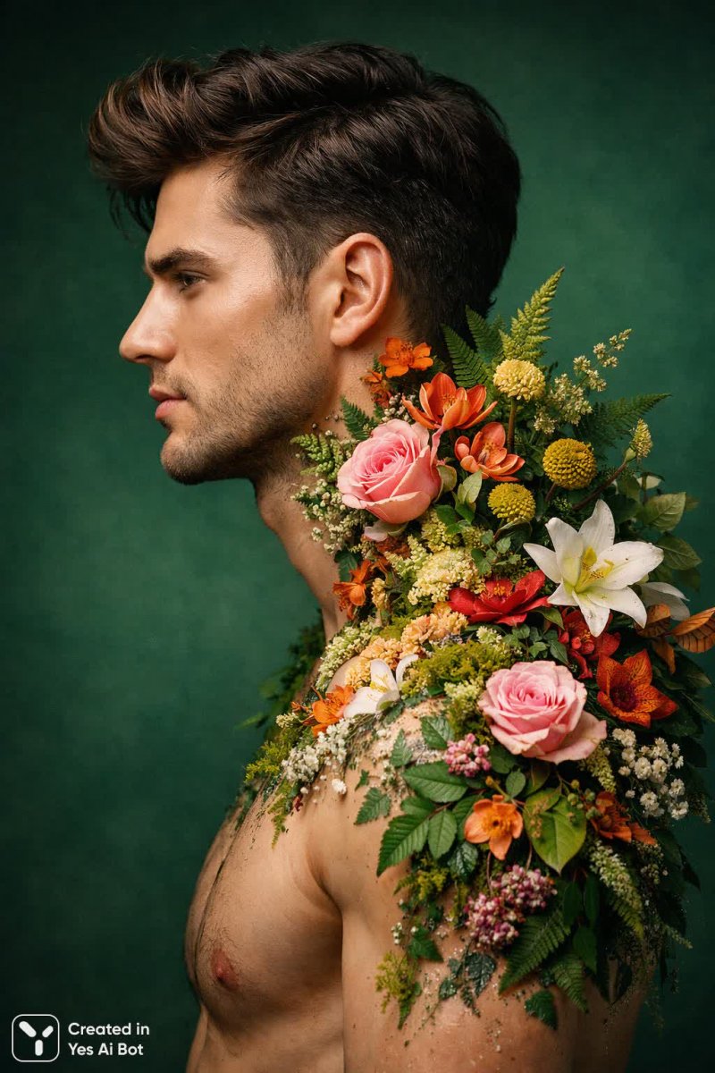 Изысканный портрет мужчины, созданный с использованием профессионального оборудования и мастерства фотографа. Камера Sony Alpha A7r IV в сочетании с объективом 85mm f/1.4 позволила запечатлеть мельчайшие детали и добиться кинематографического эффекта. Студийное освещение подчеркивает объем и текстуру, создавая драматичный контраст на фоне пышного зеленого фона. Уникальная концепция изображения предполагает частичную прозрачность областей груди и плеч мужчины, сквозь которые проглядывают великолепные декоративные растения и цветы. Кожа модели плавно переходит в яркие элементы сада, создавая ощущение единения с природой и иллюзию нереальности. Фотография выполнена в стиле фотореализма, демонстрируя ультра-высокую детализацию и высокое разрешение. Каждое лепесток, каждая травинка, каждый оттенок кожи проработаны с исключительной точностью, что позволяет зрителю полностью погрузиться в созданный мир. Это не просто портрет – это произведение искусства, сочетающее в себе техническое совершенство и художественную выразительность, которое завораживает своей красотой и оригинальностью, демонстрируя гармонию человеческой фигуры и природной стихии. Изображение излучает спокойствие и умиротворение, приглашая созерцать его великолепие и наслаждаться каждой деталью этого удивительного произведения фотоискусства