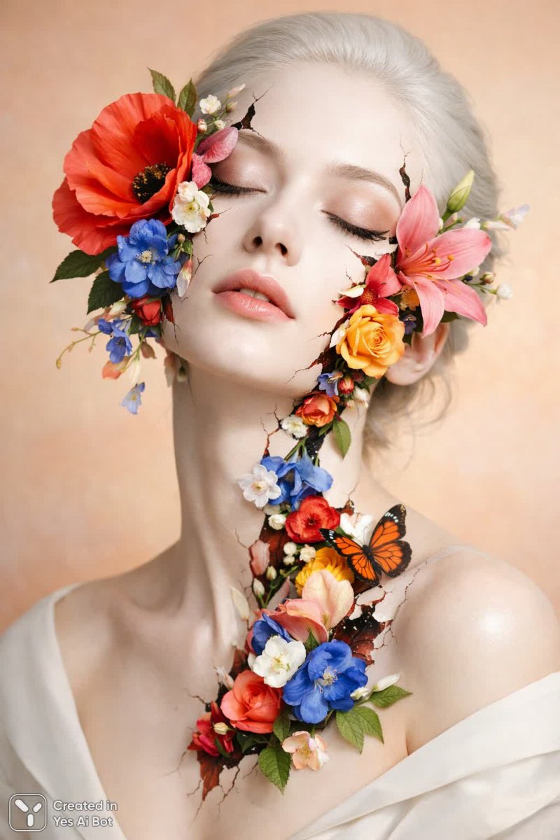 5. surreal portrait of a woman with porcelain-like skin, her eyes closed, vibrant floral elements emerging from within her chest area, creating a contrast with her serene expression, against a warm pastel background, hyperrealistic details, soft lighting, canon eos 5d mark iv, 24-70mm lens.