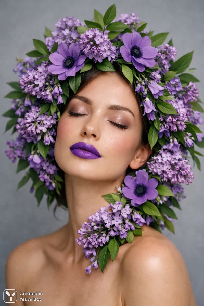 4. serene woman with smooth skin and violet lips, her head surrounded by delicate green leaves and blooming purple flowers, creating a vibrant focal point against a gentle gray backdrop, dreamy composition, high clarity, focus on textures, nikon z7, 85mm lens.