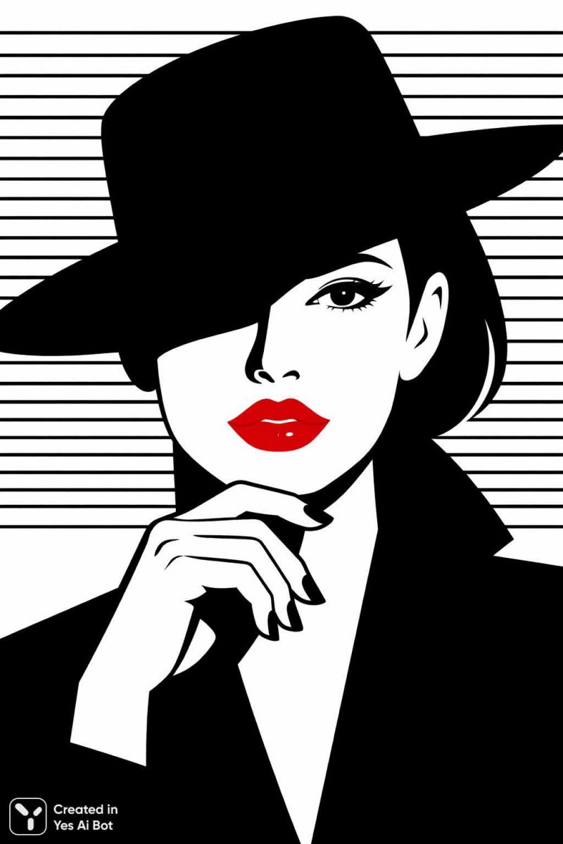 Изящный черно-белый портрет женщины, воплощающий в себе минимализм и уверенность. Акцент на губах, окрашенных в насыщенный красный цвет, приковывает взгляд и добавляет образу чувственности и загадочности. Рука, покоящаяся на подбородке, передает задумчивость или легкое размышление героини. Волосы, выполненные в виде плоских геометрических форм, частично скрыты под элегантной черной шляпой, что создает эффект таинственности и завершенности. Фон с горизонтальными линиями подчеркивает графичность изображения и добавляет ему современный вид. Вся композиция пронизана смелостью линий и лаконичностью форм, представляя собой стильный и запоминающийся образ женщины в духе модной иллюстрации. Этот эскиз идеально подходит для тех, кто ценит простоту, элегантность и выразительность в искусстве. Он может стать прекрасным украшением интерьера или частью дизайнерского проекта, добавляя нотку утонченности и изысканности. Использование контрастных цветов и четких линий делает этот портрет визуально привлекательным и запоминающимся. Это не просто иллюстрация, а настоящая декларация стиля и вкуса