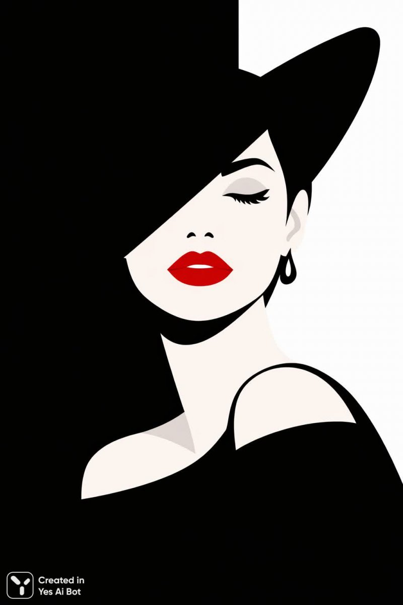 Изысканный портрет женщины, погружённой в безмятежную тишину. Её лицо, обрамлённое широкой чёрной шляпой, элегантно наклонено набок, придавая образу загадочность и утончённость. Яркая красная помада на губах – смелый акцент, контрастирующий с монохромным фоном. Фон выполнен в стиле минимализма, представляя собой простые чёрно-белые полосы, которые создают ощущение глубины и графичности. Стиль изображения характеризуется использованием плоских форм и чётких линий, что придаёт портрету современный и лаконичный вид. Вся композиция излучает спокойствие и уверенность, демонстрируя сочетание классической красоты и современного дизайна. Это не просто изображение – это визуальная поэма о женственности, элегантности и сдержанной выразительности. Впечатление от картины усиливается за счет контраста между ярким цветом губ и приглушённой палитрой фона, что делает акцент на лице модели. Использование минималистичных элементов позволяет зрителю сосредоточиться на деталях – на грации осанки, на выразительности взгляда, скрытого под закрытыми веками, на безупречном макияже. Это произведение искусства, которое заставляет задуматься о красоте в её простоте и гармонии