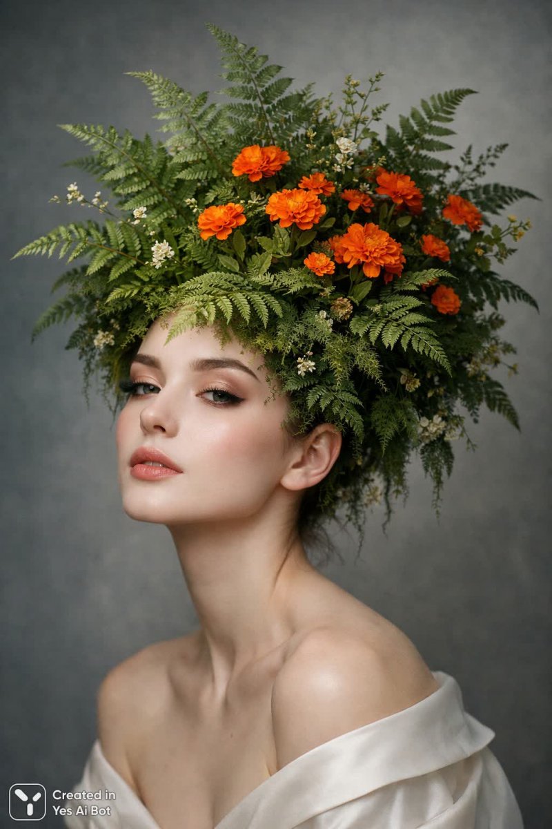 2. dreamy portrait of a woman with porcelain-like skin, her head transforming into a garden of lush green ferns and bright orange blossoms, against a muted grey backdrop, high clarity, fine details, sony a7r iv, 35mm lens, atmospheric lighting.
