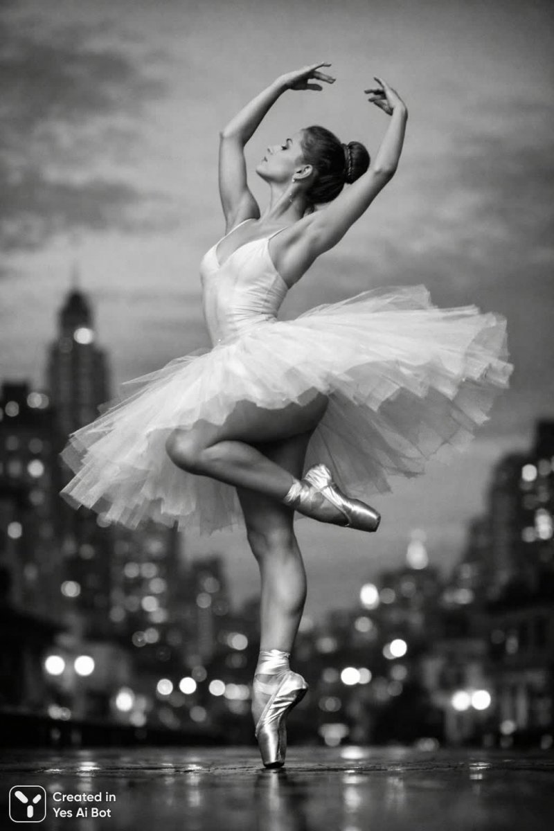 Изящная юная балерина запечатлена в волнующем моменте пируэта на черно-белом снимке, где грация и сила танца сливаются воедино. Ее серебряные пуанты подчеркивают легкость движений, а струящаяся белая пачка добавляет образу воздушности и нежности. Руки изящно вытянуты вверх, создавая ощущение полета и свободы. Волосы собраны в элегантный пучок, что акцентирует внимание на выразительном лице танцовщицы. Мягко размытый городской пейзаж на фоне, залитый сумеречным светом, придает фотографии глубину и загадочность. Высокое разрешение изображения, созданное с помощью профессиональной камеры Nikon Z7 II и объектива 85mm f/1.4, передает мельчайшие детали и текстуры, подчеркивая мастерство фотографа. Низкий угол съемки добавляет драматизма и позволяет зрителю почувствовать себя участником этого завораживающего танца, словно наблюдая за ним снизу вверх. Этот черно-белый портрет – настоящая ода красоте балета и искусству фотографии, сочетающая в себе техническое совершенство и художественную выразительность, создавая неповторимую атмосферу элегантности и вдохновения. Каждое движение, каждый жест запечатлен с невероятной точностью, отражая всю сложность и изящество балетного искусства