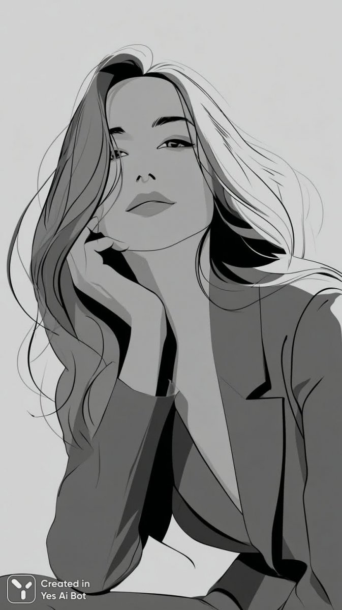Изящный монохромный портрет женщины, воплощающий в себе силу и загадочность. Четкие линии рисунка подчеркивают ее серьезное выражение лица и длинные развевающиеся волосы, создавая ощущение динамики и свободы. Рука, покоящаяся на подбородке, добавляет задумчивости и глубины образу. Лаконичный купальник-топ акцентирует внимание на фигуре, сохраняя при этом минималистичный стиль композиции. Фон выполнен в чистом белом цвете, что усиливает эффект контраста и позволяет полностью сосредоточиться на выразительном силуэте героини. Эта работа – пример элегантной простоты и мастерства, где минимум деталей создает максимум впечатления. Вся картина пронизана атмосферой уверенности и таинственности, заставляя зрителя задуматься о внутреннем мире этой загадочной женщины. Стиль рисунка отражает современную тенденцию к минимализму, придавая образу универсальность и актуальность. Это не просто портрет – это визуальная поэма о женской силе и красоте