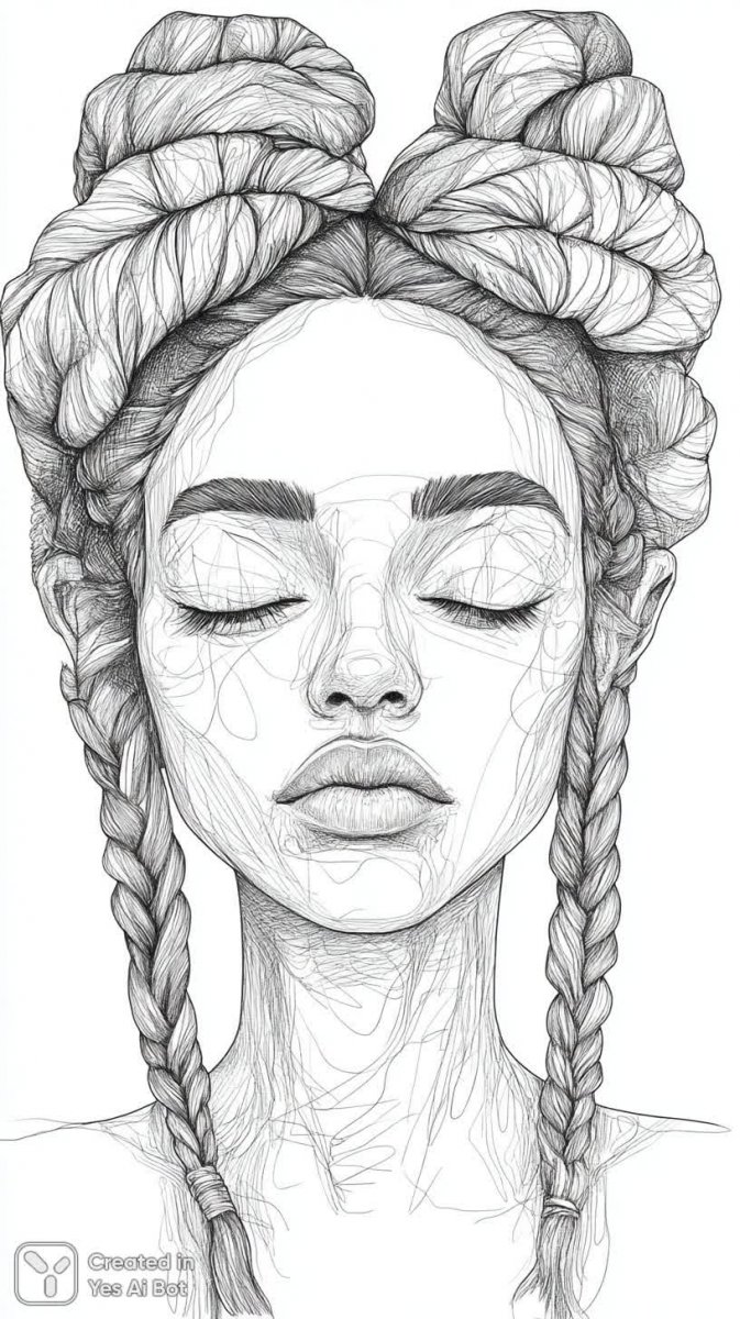 Изящный портрет юной женщины, выполненный в технике графики чёрного и белого цвета, завораживает своей простотой и умиротворением. Нежный образ передаёт атмосферу спокойствия и безмятежности. Мягкая улыбка на лице девушки, глаза, словно погружённые в мечтательное состояние, создают ощущение внутренней гармонии. Её волосы, ниспадающие волнами и заплетённые в две аккуратные косы, придают образу лёгкости и воздушности. Простота одежды – обычная футболка – лишь подчёркивает естественность и непринуждённость момента. Белый фон усиливает эффект минимализма, позволяя зрителю сосредоточиться на деталях лица и волос. Эта работа представляет собой оду красоте в её чистейшей форме, где каждый штрих линии несет в себе глубокий смысл, передавая тонкие нюансы настроения и эмоций. Композиция выдержана в строгих рамках лаконизма, что делает изображение особенно выразительным и запоминающимся. Кажется, будто время замерло, позволяя насладиться моментом покоя и внутренней тишины, который так редко встречается в суете современной жизни. Этот рисунок – воплощение гармонии и спокойствия, способное подарить зрителю ощущение умиротворения и вдохновения