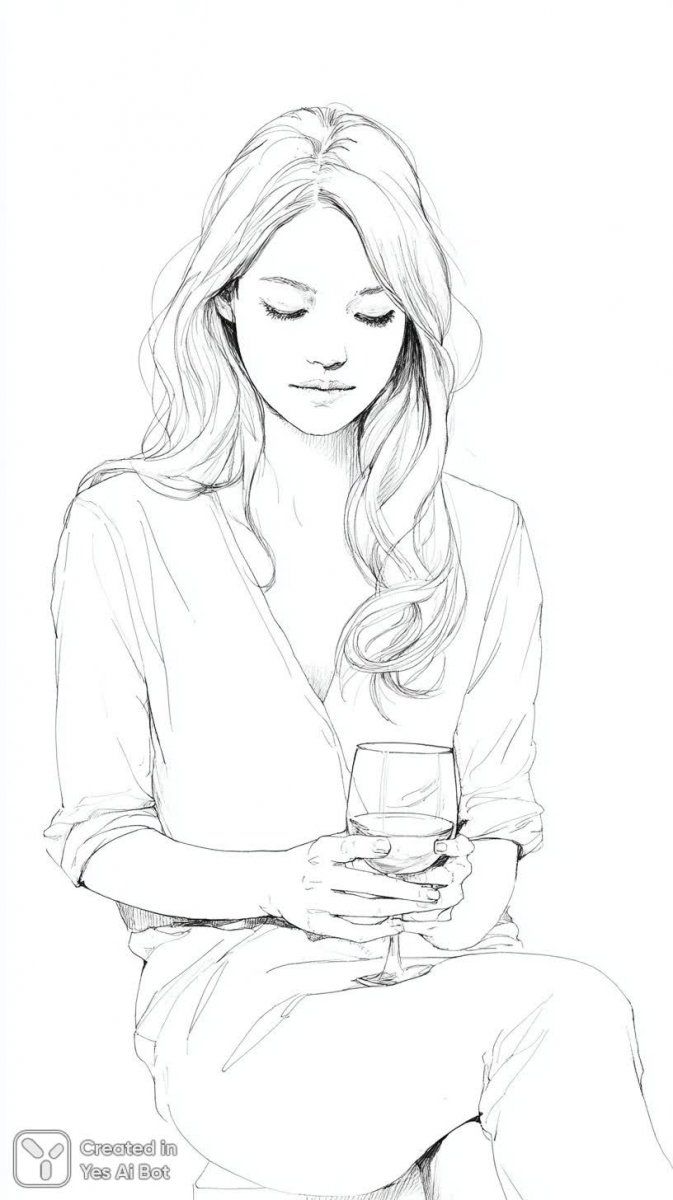 black and white line drawing of young woman sitting casually with glass of wine, long flowing hair styled in loose waves, seductive expression, eyes slightly closed, bg is plain white, minimalism, bw sketch.