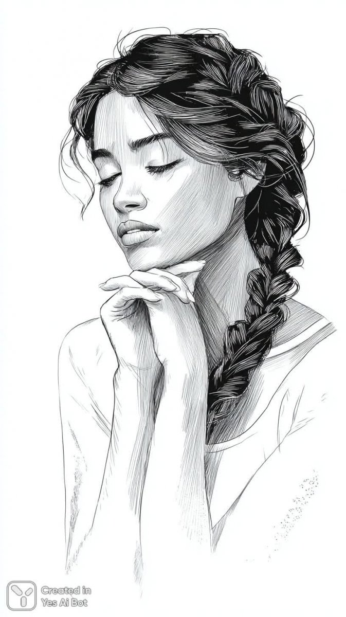Изящный черно-белый эскиз лица прекрасной женщины завораживает своей простотой и глубиной. Длинные косы, частично собранные в аккуратную прическу, придают образу утонченность и женственность. Взгляд, направленный вдаль, излучает спокойствие и безмятежность, отражая внутреннюю гармонию и задумчивость. Лаконичная майка подчеркивает естественную красоту модели, а рука, небрежно опирающаяся на подбородок, создает ощущение созерцания и размышления. Минималистичный стиль исполнения позволяет сосредоточиться на деталях лица и передать тонкую гамму эмоций. Белый фон усиливает эффект чистоты и ясности, делая рисунок еще более выразительным и запоминающимся. Эта работа – ода женственности, спокойствию и красоте простых вещей, воплощенная в элегантном черно-белом изображении. Она словно приглашает зрителя заглянуть в мир мечтаний и тихой радости, где царит умиротворение и гармония с собой. Каждый штрих пропитан чувством тонкости и деликатности, создавая неповторимую атмосферу созерцания и внутренней свободы. Это не просто портрет, это история, рассказанная без слов, через линии и тени, запечатленная на бумаге в вечном черно-белом танце света и тьмы
