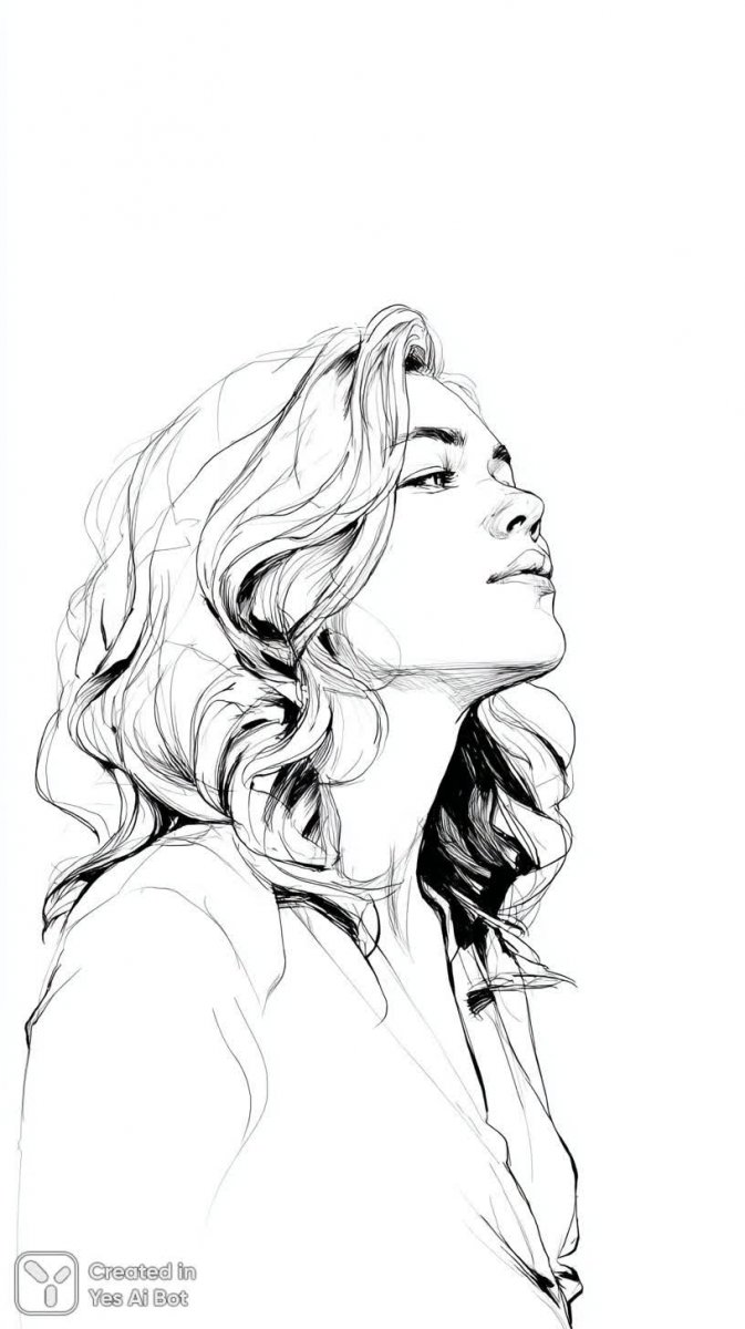 Изящный портрет женщины в стиле минималистичной графики, выполненный тонкой линией на контрастном черно-белом фоне. Изображение передает атмосферу задумчивости и мечтательности благодаря выражению лица героини, словно она погружена в свои мысли или воспоминания. Вьющиеся волосы мягко струятся по плечам, подчеркивая плавность линий рисунка и создавая ощущение легкости. Элегантный блузон добавляет образу утонченности и изысканности. Четкие линии и отсутствие лишних деталей характерны для стиля линейной графики, что позволяет сосредоточиться на передаче эмоций и общей композиции. Этот скетч представляет собой пример классического чернильного рисунка, выполненного с использованием техники line art, где каждая линия играет важную роль в создании целостного образа. Монохромная палитра усиливает эффект графичности и придает работе вневременной шарм, делая ее привлекательной для любителей минимализма и элегантных изображений. Это не просто портрет, а запечатленная мимолетность момента, наполненного тихой красотой и внутренней гармонией