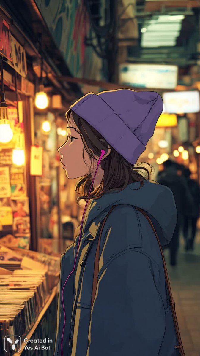 cartoon anime girl with purple beanie, stylish earbuds, at a vibrant street market; BG: graffiti-covered walls, string lights; crisp outlines, high quality, dynamic angles, playful atmosphere.