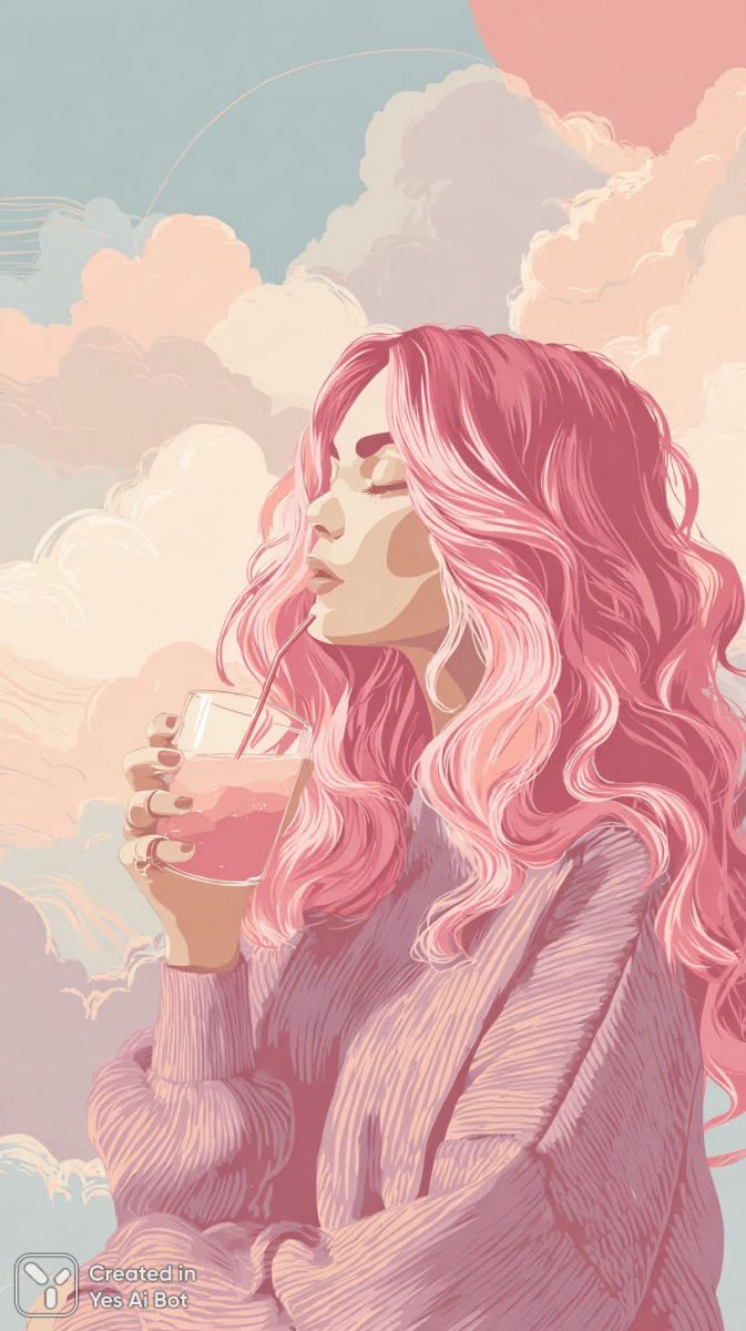 Очаровательная девушка в стиле аниме и мультфильма с яркими розовыми волосами излучает безмятежность и уют. Она одета в просторный свитер, идеально подходящий для спокойного времяпрепровождения, и наслаждается красочным напитком. Фон представляет собой нежное сочетание пастельных облаков, создающих атмосферу мечты и тепла. Чистые векторные линии подчеркивают детализированность изображения, а общий образ наполнен волшебством и игривостью. Этот персонаж словно сошел со страниц любимой сказки, даря ощущение легкости и радости. Детализация проработана с любовью к каждой мелочи, от текстуры свитера до бликов на поверхности напитка, что делает изображение еще более живым и привлекательным. Пастельные тона создают мягкую и гармоничную палитру, располагающую к отдыху и созерцанию. Этот арт – идеальное сочетание милоты, стиля и визуального совершенства, способное поднять настроение и вдохновить на новые свершения. Он воплощает в себе мечту о беззаботном мире, где царит красота и волшебство. Яркий розовый цвет волос выделяет героиню из толпы, делая ее запоминающимся образом