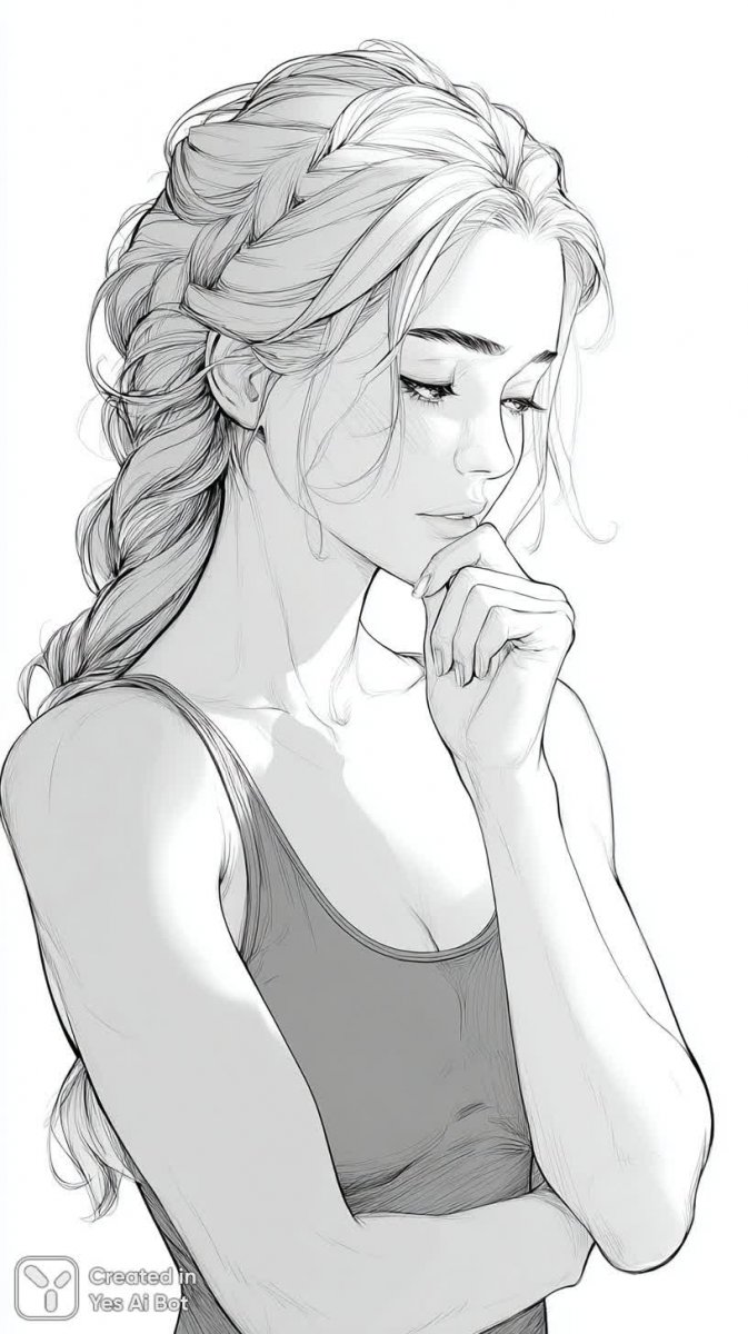 Изящный монохромный портрет молодой женщины, выполненный в технике графики. Линия за линией создается образ задумчивой красавицы с длинными заплетенными волосами, обрамляющими строгое, но умиротворенное лицо. Ее взгляд направлен вдаль, а подбородок покоится на ладони, подчеркивая момент внутренней сосредоточенности и спокойствия. Простота силуэта, акцентированная легким танком-топом, придает композиции минималистичный шарм. Фон – чистый белый холст, не отвлекающий внимание от главного объекта изображения. Это графическое эскиз в стиле линейного искусства, передающий атмосферу тишины и внутренней гармонии. Каждая линия четко очерчена, создавая эффект глубины и текстуры, несмотря на отсутствие цвета. В целом, изображение излучает утонченность и элегантность, являясь прекрасным примером сдержанной красоты в черно-белом исполнении. Оно способно вызвать чувство спокойствия и созерцательности у каждого зрителя. Это не просто рисунок – это запечатленный момент размышления, воплощенный в изящных линиях и минималистичном стиле
