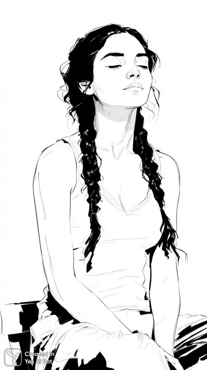 black and white sketch of a young woman sitting casually, hair styled in two braids on either side, wearing a strapless top, serious expression with eyes closed, overall mood is powerful and mysterious, minimalism focused, bg is plain white.