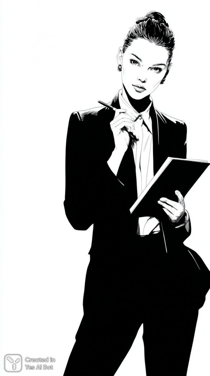 Изображение представляет собой монохромный рисунок от руки, выполненный в технике линии и штриха, демонстрирующий элегантную деловую женщину в строгом костюме. Ее лицо выражает уверенность и сосредоточенность, взгляд направлен вперед с решимостью. В руках она держит блокнот и ручку, готовясь зафиксировать важные мысли или идеи. Прическа выполнена в аккуратной профессиональной прическе, подчеркивающей ее деловой стиль. Общая атмосфера рисунка пронизана амбициями и динамизмом, передавая ощущение целеустремленности и продуктивности. Фон выполнен в чистом белом цвете, что позволяет выделить фигуру женщины и акцентировать внимание на деталях изображения. Минималистичный подход к композиции создает эффект строгости и элегантности, отражая современный деловой стиль. Рисунок передает образ успешной и целеустремленной личности, готовой решать сложные задачи и добиваться поставленных целей. Использование только линий и отсутствие цвета подчеркивают графическую природу изображения и придают ему лаконичность и выразительность. Это визуальное воплощение профессионализма, уверенности в себе и стремления к успеху. Каждая линия аккуратно прорисована, создавая ощущение точности и внимания к деталям. Композиция гармонична и сбалансирована, что делает изображение привлекательным для восприятия
