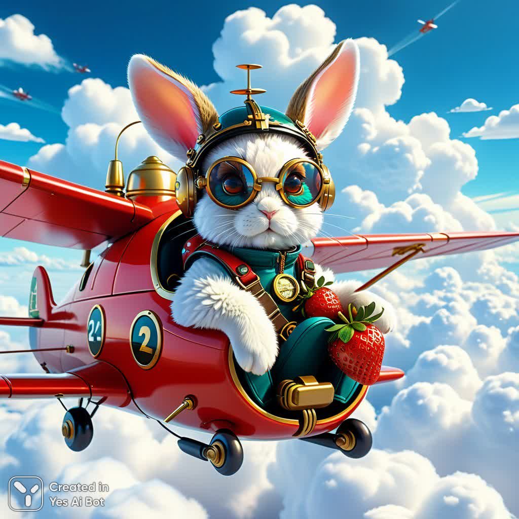 Восхитительное зрелище – очаровательный кролик с пушистыми ушками, облаченный в костюм пилота и стильные очки, управляющий одноместным самолетом. Удивительно, но конструкция этого воздушного судна выполнена из огромных, спелых клубник! Крошечный летчик уверенно маневрирует среди белоснежных перистых облаков, создавая сказочную картину в духе стимпанка. В конструкции самолета заметны детализированные золотые механические элементы, добавляющие образу футуристический шарм и подчеркивающие его фантастическую природу. Сочетание нежной клубничной структуры, сложного steampunk дизайна и элементов научной фантазии создает неповторимую атмосферу волшебства и приключений. Это поистине уникальное произведение искусства, где милый пушистый зверек становится отважным пилотом в необычном, сладком и механизированном самолете, покоряющем небеса среди облаков. Картина излучает легкость, беззаботность и вдохновляет на мечты о невероятных путешествиях в волшебные миры. Она вызывает чувство умиления и восторга перед мастерством исполнения и оригинальностью идеи. Это визуальный гимн фантазии, воплощенный в ярких цветах и деталях