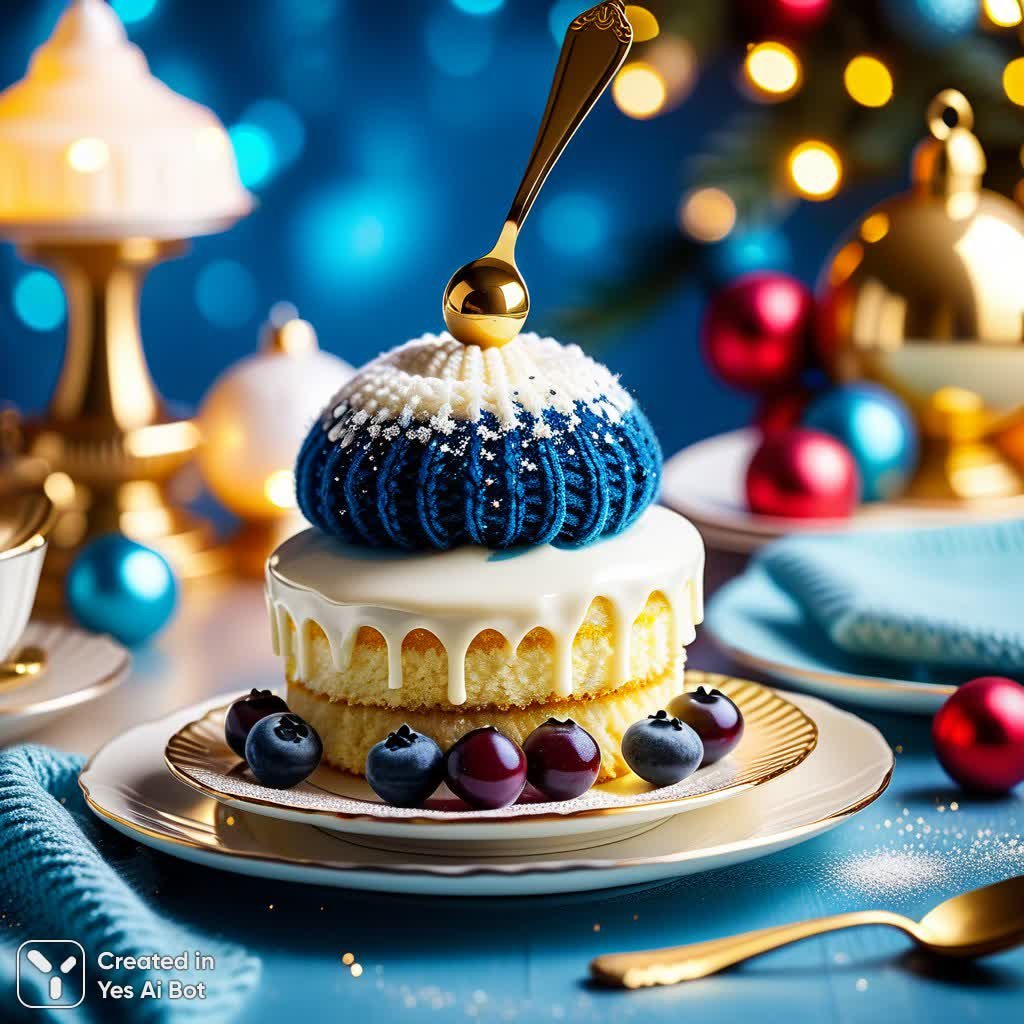 Изысканный десерт в стиле ретро, словно сошедший с полотен старинных мастеров, представлен на потертой, но элегантной тарелке с золотым орнаментом. В центре композиции – восхитительный торт, мастерски воссоздающий форму уютного вязаного белого берета, украшенного пушистым кремовым помпоном. Рядом с ним примостилась изящная золотая ложечка с утонченным декором, а рядом - аппетитный кусочек торта с насыщенной синей начинкой из черники, намекающий на его неидеальную, но очаровательную красоту. За всей этой сказочной картиной скрывается мягкое свечение праздничных огней, создающее атмосферу волшебства и безмятежности. Это настоящее произведение кулинарного искусства, где каждая деталь продумана до мелочей, а сочетание текстур и цветов пробуждает самые приятные воспоминания о тепле домашнего очага и радости встречи с близкими людьми. Подача блюда выполнена с особым вниманием к деталям, подчеркивая его неповторимый характер. Этот десерт – не просто угощение, а настоящее событие, способное подарить незабываемые эмоции и ощущение праздника. Он словно приглашает насладиться каждым мгновением, вкусом и ароматом, погружаясь в атмосферу уюта и тепла