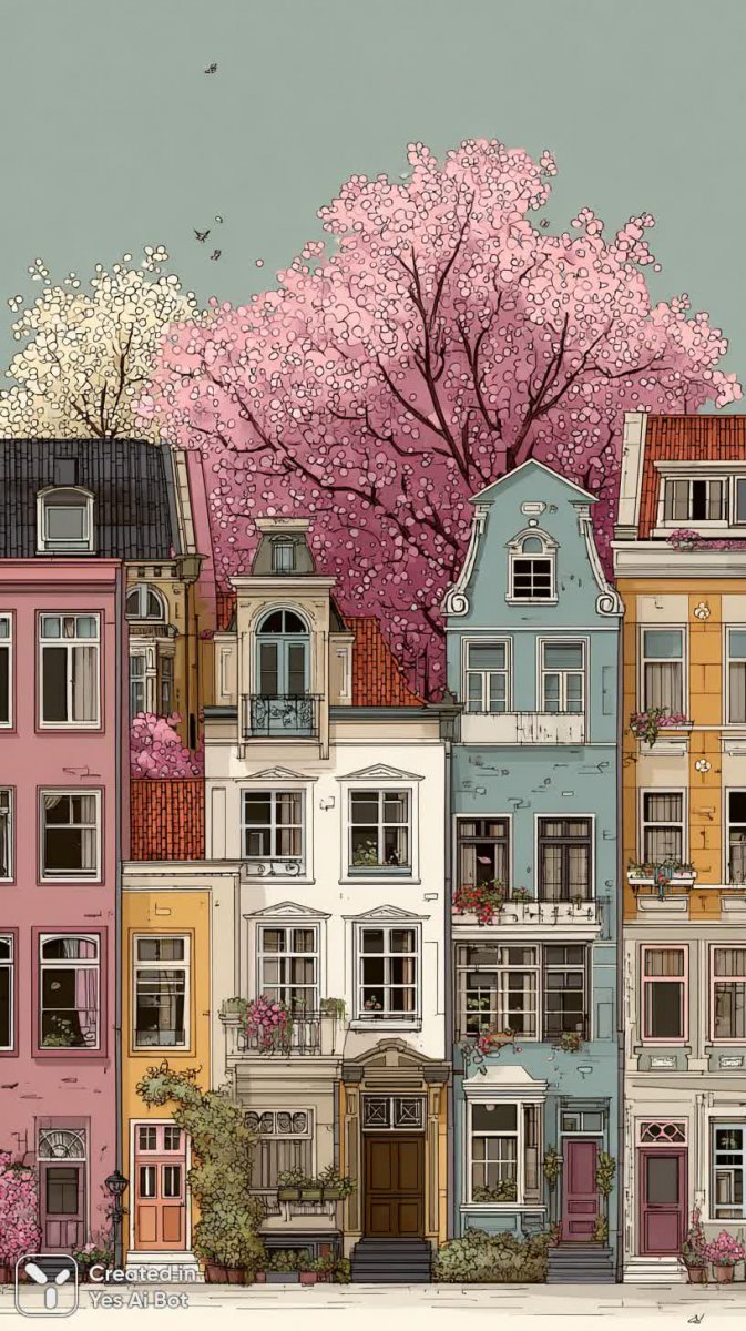 Уютная улица с цветущими домами и ярким настроением - Картинка, созданная ИИ Midjourney